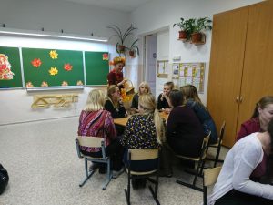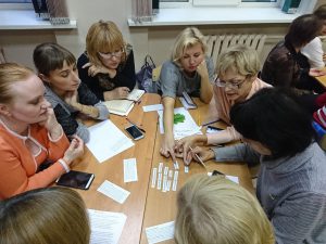 Дальнейшее знакомство с методами креативного обучения проходило в практической форме. В начале игры гостей поприветствовала – Осень – Кичакова Татьяна Валентиновна. Использовав метод ассоциаций, она узнала у участников игры о тех чувствах и эмоциях, которые они испытывают, когда слышат об эвристическом обучении, и задала тему мероприятию. Далее каждая команда наших гостей получила своё задание. В течение 10-12 минут они работали в группах под руководством наших учителей: Зуевой Таисии Владимировны, Просвиряковой Татьяны Валерьевны, Булавиной Елены Владимировны и Дуркиной Аллы Владимировны. Задача каждой группы заключалась в  показе возможности использования методов эвристического обучения в начальной школе. Группы создали образовательный продукт и защитили его.