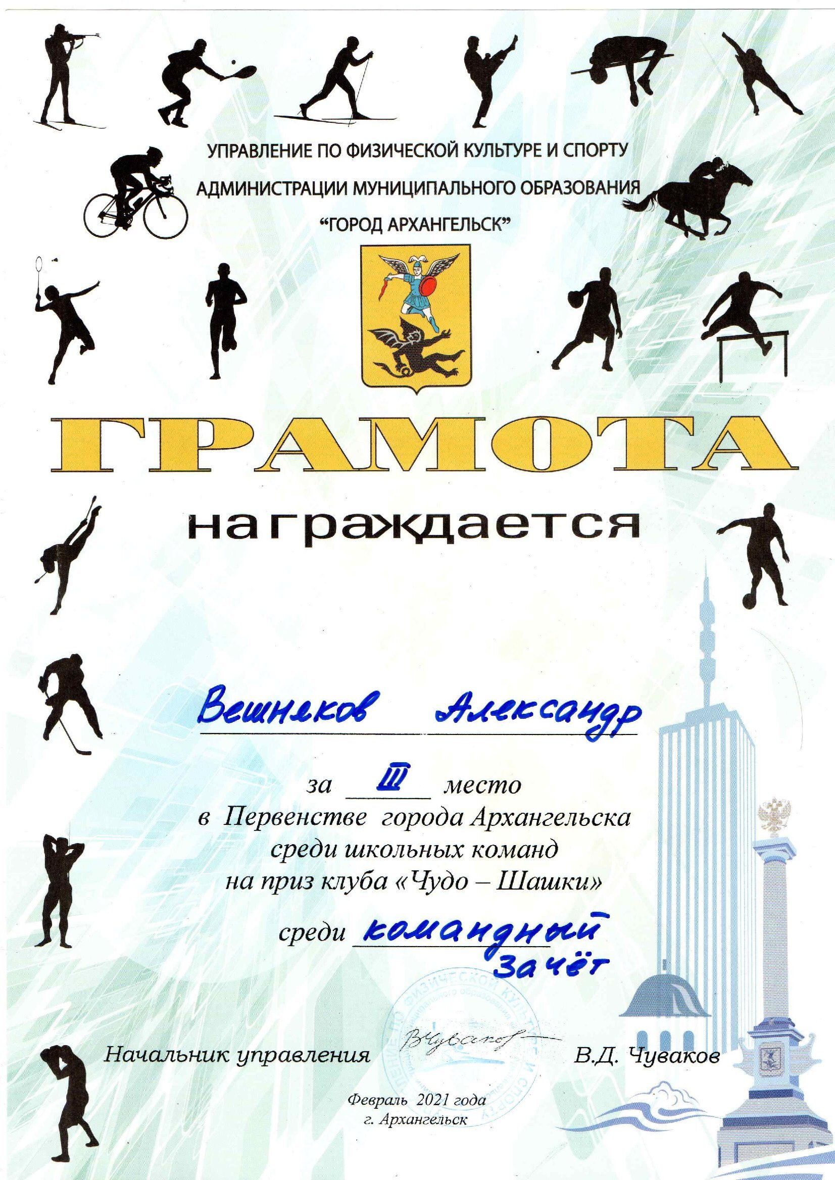 Кроме предметных олимпиад Вешняков Александр участвовал в Первенстве города Архангельска среди школьных команд на приз клуба «Чудо-Шашки» в составе команды учащихся нашей гимназии. Ребята стали призёрами и заняли 3 место.